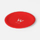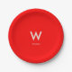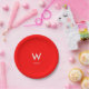 Platos de papel para fiestas personales de moda con fondo rojo, monograma grande centrado y nombre asociado. Tipografía minimalista limpia y simple. Totalmente personalizable.