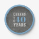 Añada un toque personalizado fresco a su celebración de cumpleaños con estos platos de fiesta con temática de "vítores" en pizarra gris y azul. El diseño presenta "vítores a xx años" en el centro. Ejemplo mostrado para un fiesta de 40 años; personalizar con cualquier edad.