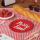 "Tiempo de Fiesta" escrito en un rotulador sobre un fondo rojo de explosión de sol.