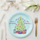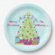 Disfruta de estos adorables y modernos platos de árboles de Christman para celebrar las vacaciones de los Navidades. Los platos tienen las palabras "Feliz Navidad" y tu nombre. El flamante árbol de Navidad tiene un colorido cumpleaños o regalos de Navidad alrededor del fondo y tiene el nombre personalizado y las palabras "Feliz Navidad". El árbol está decorado con adornos rojos y una bola de oro en la parte superior con cinta girando hacia abajo. El fondo es una textura de pintura turquesa sobre blanco. Este diseño es arte original de Phyllis Dobbs y viene en servilletas de papel y otros productos para entretenimiento coordinado. Personalizable completo.