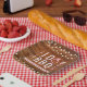 Este diseño rústico rojo marrón Fijo BBQ presenta un fondo de madera rústica con luces de cuerda y gráficos de parrilla. Este diseño es perfecto para fiestas de compromiso y barbacoa para parejas.