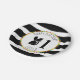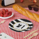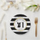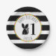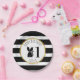 Platos de papel de cumpleaños con un ilustracion de un zorrillo de bebé que lleva una corona de flores. El fondo es de rayas blancas y negras con diseño pom. Personalice el nombre y el número