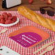 Este divertido y colorido diseño retro presenta un tema de puesta de sol naranja y rosa brillante.