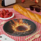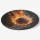 Un baloncesto envuelto en llamas es capturado al aire mientras se acerca al aro, enfatizando el movimiento dinámico y la intensidad