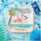 Divertidos platos de papel para fiestas de cumpleaños con un flamingo rosa en la playa disfrutando de un cóctel tropical al lado de una palmera con la leyenda "celebremos" en escritura moderna e informal. Perfecto para fiestas de piscina, relaves de playa y temática playera, celebraciones de verano.