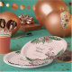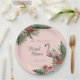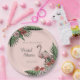 Estos elegantes platos de papel con ducha de novia cuentan con ilustraciones de color flamingo tropical a mano con tintas negras, flamencos rosas, hibiscos y flores jazmín, hojas tropicales, piña y bebida tropical. Elegante fondo rosa. Todo el texto es editable.