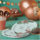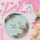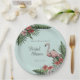 Estos elegantes platos de papel con ducha de novia cuentan con ilustraciones de color flamingo tropical a mano con tintas negras, flamencos rosas, hibiscos y flores jazmín, hojas tropicales, piña y bebida tropical. Elegante fondo turquesa. Todo el texto es editable.