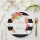 Flamingo Tropical Flowers Pink and black Stripe personal Baby Shower. Este bello diseño floral y floral es un diseño divertido para celebrar a la madre. Su información se introduce fácilmente en las placas de papel para bebés. Flores de rayas negras y rosas y flamencos son la base de este moderno diseño personalizado Baby Shower.