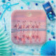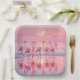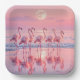Los flamencos rosados se alinean con elegancia a lo largo de una playa reflejada en el agua tranquila a medida que una luna rosa llena se eleva en el cielo pastel