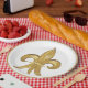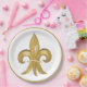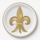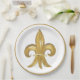 Este plato fiesta presenta una flor de lis dorada en el centro sobre un fondo blanco brillante con una llanta dorada alrededor del borde. Coordina con los demás productos de mi colección Mucho sobre nada.