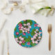 Flores de manzana dibujadas a mano y abejas con un fondo turquesa