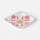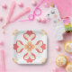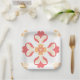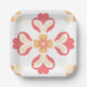 Un diseño floral simétrico combina los colores rosa, melocotón y crema con un fondo blanco. La flor central está rodeada de formas pétalas que forman un patrón de cruz.
