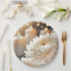 En primer plano, el primer plano de las flores de crisantemo blanco se despliega con velas que brillan suavemente y que se desdibujan como telón de fondo, creando un ambiente cálido y sereno