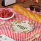 Estos platos de papel súper bonitos para el primer cumpleaños presentan un marco floral dibujado a mano, que incluye margaritas, en naranjas, rosas, verdes de color oliva, dorado mudo y blanco. La tipografía retro dice: "Uno" en la combinación de verde oliva. *Ilustracion de Tracey Khalei / Orabella Prints.