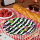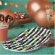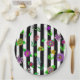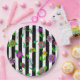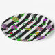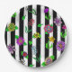 Placas de papel floral de bonito con flores moradas, rosas, azules, verde azuladas y amarillas con fondo rayado negro y blanco. Bonito para bodas, cumpleaños o duchas para bebés.