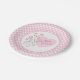 Felicite a las mamás nuevas o futuras con estilo con estos platos de baby shower personalizables para niñas que presentan delicadas flores rosadas, moradas y durazadas sobre un clásico fondo de gingham rosa. Un encantador corazón y un borde con borde escalopado de moda completan este diseño. El texto personalizable que dice "Es una niña" le permite agregar su propio mensaje. Perfecto para baby showers, fiestas de revelación de género o cualquier celebración que dé la bienvenida a una dulce niña.