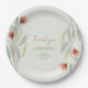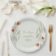 Plato de papel de boda personalizable con flores rojas de acuarela, hojas verdes salvia sobre un fondo verde pálido y espacio para texto personalizado.
