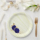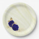 Hermosas flores azules reales y hojas de oro contra el fondo de mármol boda placa de papel