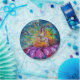 Feria colorida y caprichosa sentada sobre una flor de fucsia rosa con brillantes dorados. Pintura acrílica en blanco, colores rosa verde amarillo, dorado y plateado con colores irrisorios. (c) de Bulgan Lumini