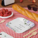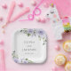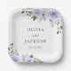 Añada un toque personal a la celebración de su boda con estos artículos fiestas elegantes y memorables. El diseño presenta flores de color morado y vegetación sobre fondo blanco.