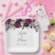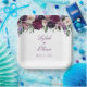 Flores acuáticas en tonos burdeos ricos, lila suave, orquídea de berenjena profunda púrpura y rosa con botánicos verdes modernos como helechos y eucaliptos en estos románticos y elegantes platos de papel para bodas.