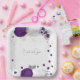 Flores románticas reales moradas y blancas con hojas de plata placa de papel boda botánico.