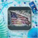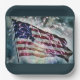 Esta imagen norteamericana, de bandera, está resaltada en contra, fuegos artificiales reventando, en una colorida exhibición de bengalas rojas, blancas, azules y amarillas, en un cielo nublado y crepúsculo, de pizarra azul.