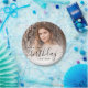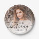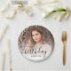 Platos modernos de papel para fiestas de cumpleaños con una foto personalizado. Reemplace fácilmente la imagen de muestra con una foto del invitado de honor. La palabra "cumpleaños" aparece en un elegante guión de escritura a mano en negro. Personalice el texto con el nombre y el año de cumpleaños en el tipo de letra sans serif negro. Una superposición de degradado blanco ayuda a hacer que el texto aparezca.