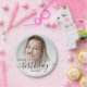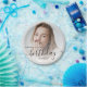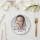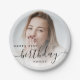 Platos modernos de papel para fiestas de cumpleaños con una foto personalizado. Reemplace fácilmente la imagen de muestra con una foto del invitado de honor. La palabra "cumpleaños" aparece en un elegante guión de escritura a mano en negro. Personalice el texto con el nombre y el año de cumpleaños en el tipo de letra sans serif negro. Una superposición de degradado blanco ayuda a hacer que el texto aparezca.