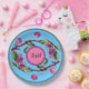 Plato De Papel Fruta rosa con arándanos en turquesa con pergamino