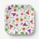 Diversos platos de papel cuadrado de Halloween con caramelos, calabazas y gorras de brujas en naranja, verde y morado sobre un fondo blanco. Este plato de papel sería genial para una fiesta de cumpleaños temática de Halloween o para un fiesta de disfraces de fiesta de Halloween.