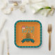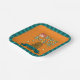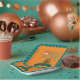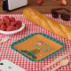Adorables y divertidas planchas de papel para alegrar a tu fiesta. Sobre un fondo naranja el diseño comienza desde arriba con Feliz Cumpleaños en texto verde y amarillo con un pastel con hielo rosa y tres velas encendidas al lado del H en feliz. Debajo del texto hay una linda y graciosa papa marrón con los brazos pegados y una gran sonrisa. Al otro lado de la papa hay un cartel azul con una plantilla para agregar su nombre a personalizar. Por último, tres estrellas amarillas están repartidas por la papa.
