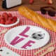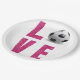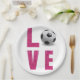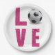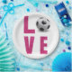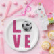 El diseño de las palabras de Love Soccer con letras brillantes de color rosa intenso y el "o" es reemplazado por una pelota de fútbol.