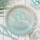 Este plato de papel en los suaves colores del mar y la arena le permite añadir fácilmente su propio nombre y texto usando la plantilla proporcionada. Las gafas de sol simples y la imagen de las sandalias en un fondo acuático angustiado se realzan con un acento ondulado en agua y blanco. Busque ID623 para ver la coordinación de elementos costeros y productos adicionales con este diseño.