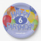 Estas divertidas y coloridas placas de papel para fiestas de cumpleaños incluyen el mensaje "Feliz Cumpleaños" escrito en galletas de corte espumoso y riquísimamente dispuestas con espuma azul rodeadas de globos multicolor y banderas de amarre - la edad y el nombre del niño se pueden personalizar - por katz_d_zynes