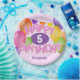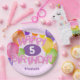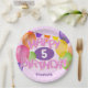 Estas divertidas y coloridas placas de papel para fiestas de cumpleaños incluyen el mensaje "Feliz Cumpleaños" escrito en galletas esmeriladas rosadas dispuestas de forma caprichosa rodeadas de globos multicolores y banderas de amarre - la edad y el nombre del niño se pueden personalizar - el fondo es un patrón de pequeños puntos de polka blancos sobre rosa pálido - de katz_d_zynes