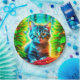 Gatito gris lindo sentado frente a las servilletas de papel de los árboles de Navidad iluminadas para tu fiesta de Navidades.