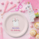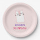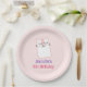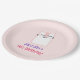 Un plato de papel personalizado para cumpleaños con una ilustración de un lindo gatito durmiendo. Ojos cerrados con aspecto feliz y tranquilo. Puesto sobre un fondo rosa p