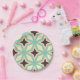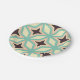 Geometric pattern with alternating dark star shapes surrounded by layered hexagonal outlines in teal, cream, and beige, creating a symmetrical, retro vibe.