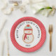 Esta placa de papel de intercambio de galletas presenta una galleta de pan de jengibre de snowman sobre un fondo blanco y un punto de polka rojo y blanco en el borde exterior. Coordina con la colección Navidades Cookie Exchange.