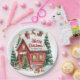 Un elegante diseño invernal con una casa de pan de jengibre, reno volador, abetos con estrellas y regalos.