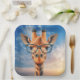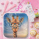 Una jirafa usa elegantes gafas con bordes negros contra un fondo del cielo que le da un aspecto expresivo y caprichoso.