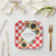 Platos personalizados de papel para bodas rústicas para la ducha de tu pareja, ducha de novia, ducha de boda campestre o Me Casaré BBQ presentan un borde de gingham con girasoles de acuarela y vegetación en un patrón de cuadros tartán rojo. Personaliza con tus nombres y fecha. Para ver más diseños de impresión gingham como este visita www.zazzle.com/vginvites