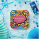 A vibrant pop art style invitation design featuring a large pink speech bubble prominently placed in the center against a white background. The speech bubble has a glossy, cartoon-like appearance with a bold black outline and small circular highlights, ready to contain party details or messages. Surrounding the central bubble, colorful pop art elements burst with energy including comic book-style "POW!" and "BOOM!" text effects, rainbow starbursts, polka dot patterns, and lightning bolt shapes in bright primary colors of red, blue, yellow, and green. The overall design captures the playful, high-energy aesthetic of 1960s pop art with bold outlines, Ben-Day dot patterns, and a cheerful color palette perfect for a children's celebration.