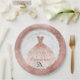 Alimenta a sus fiestas con estilo con estos elegantes y personalizados platos de papel de Quinceañera de rosa con un brillante vestido de oro rosa con tacones purpurinas y borde de diamante sobre una seda y un brillante fondo de oro rosa. Guión elegante en gris suave. Fácil de personalizar con las opciones de personalizado.