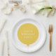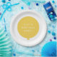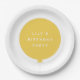 Sencillo, elegante y divertido plato de fiesta de cumpleaños para niños con su nombre personalizado en tipografía moderna en blanco crudo sobre un sencillo diseño de globo redondo en amarillo sol con una cuerda gris recta en un minimalista estilo escandinavo. ¡Añade el nombre de tus hijos o el de un hijo de un ser querido para un fiesta verdaderamente único y hecho a medida!