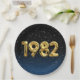 Globos dorados de cumpleaños mylar para el cumpleaños en 1982 sobre fondo negro gradiente y azul con estrellas nocturnas.