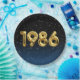Globos dorados de cumpleaños mylar para 1986 cumpleaños en fondo negro gradiente y azul con estrellas nocturnas.