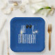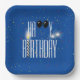 White Happy Birthday texto sobre fondo azul con confeti, velas, globos negros y chispas. Se puede cambiar el color de fondo.