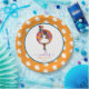 Este diseño presenta a una hermosa mujer negra con un vestido blanco y zapatos sobre un fondo azul turquesa y naranja con flores rosadas, sosteniendo 3 globos.